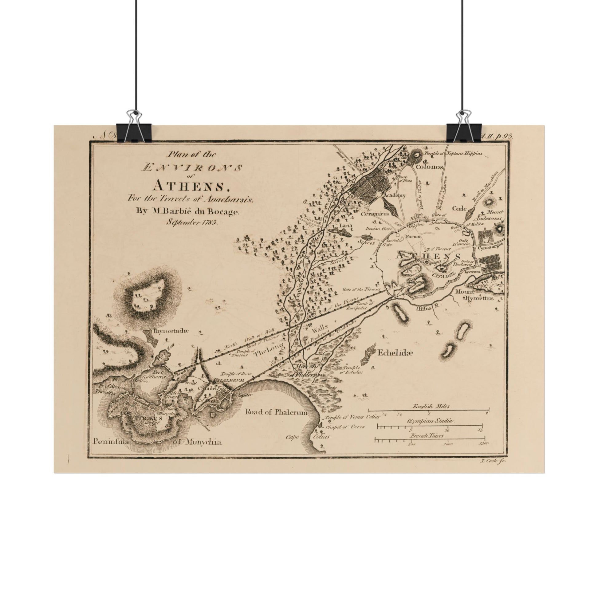 Antique Map of Athens (1785) — Barbie du Bocage, Plan of the Environs of Athens for the Travels of Anacharsis