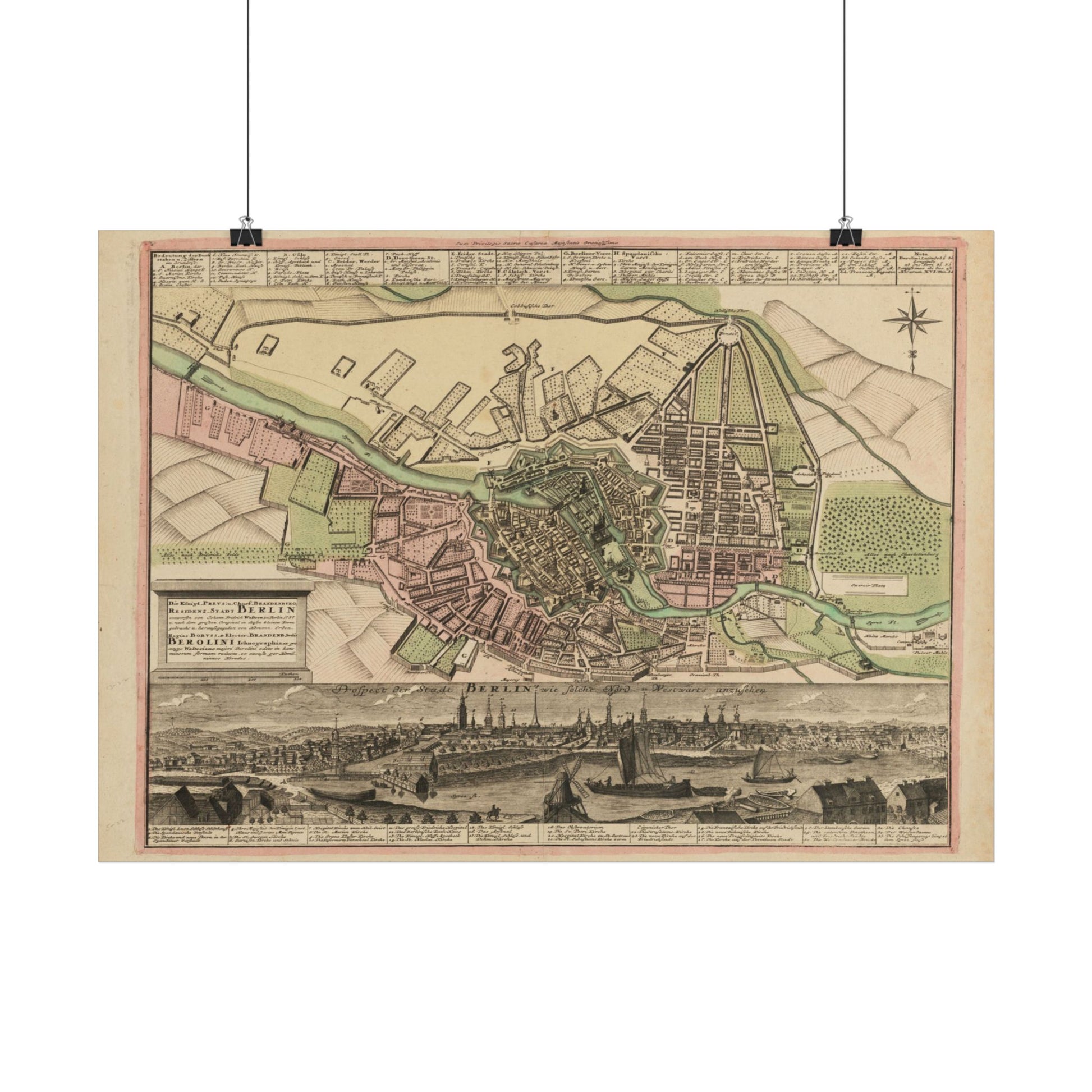 Below the plan lies a striking panoramic view of Berlin, labeled “View of the City of Berlin as Seen from the North-West”. It captures the city’s skyline from the riverfront, complete with ships, bridges, and church spires, providing a vivid glimpse of Prussian urban grandeur in the 18th century.