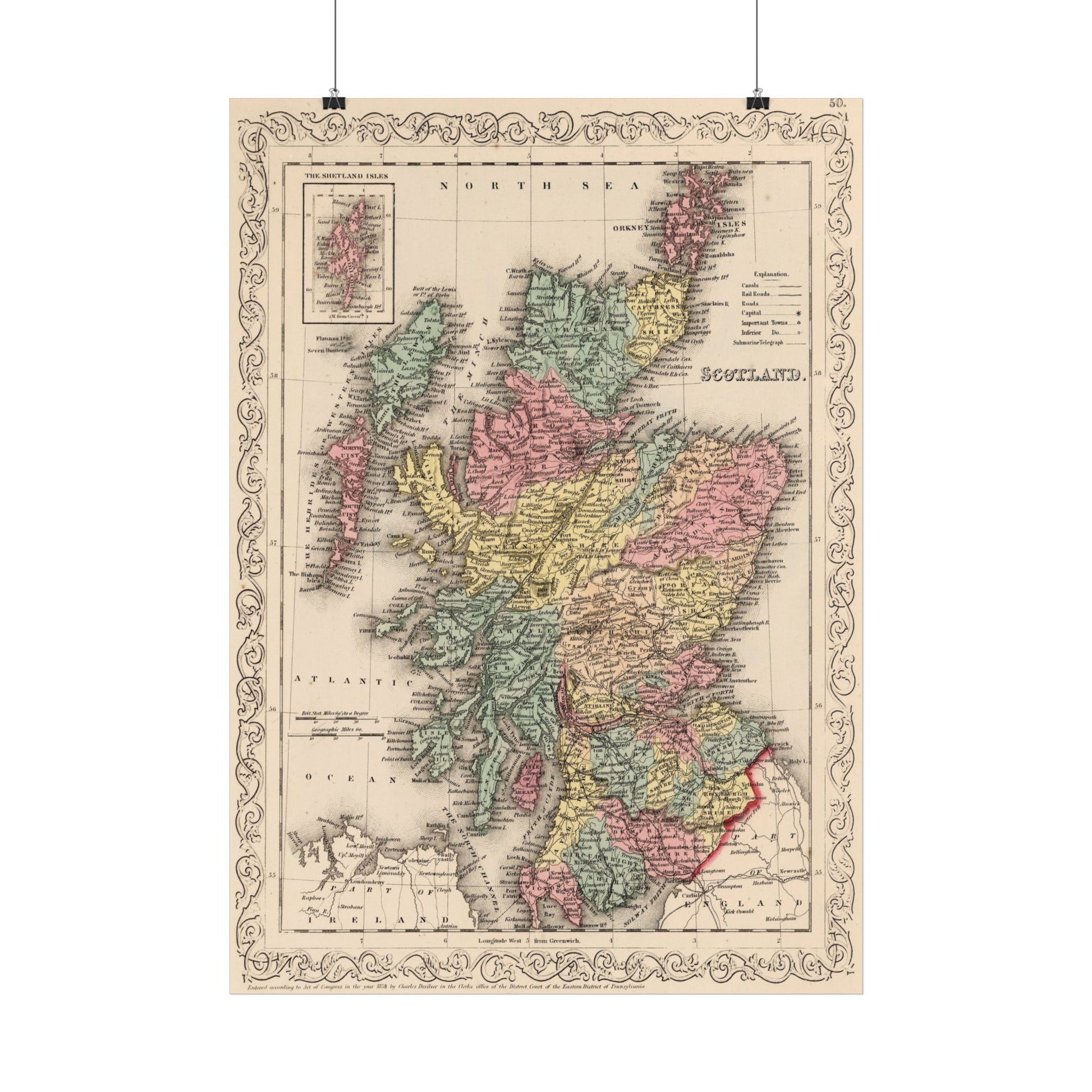 Published in Philadelphia by Samuel Augustus Mitchell in 1859, this beautifully colored engraved map of Scotland captures the nation at the height of the Victorian era.