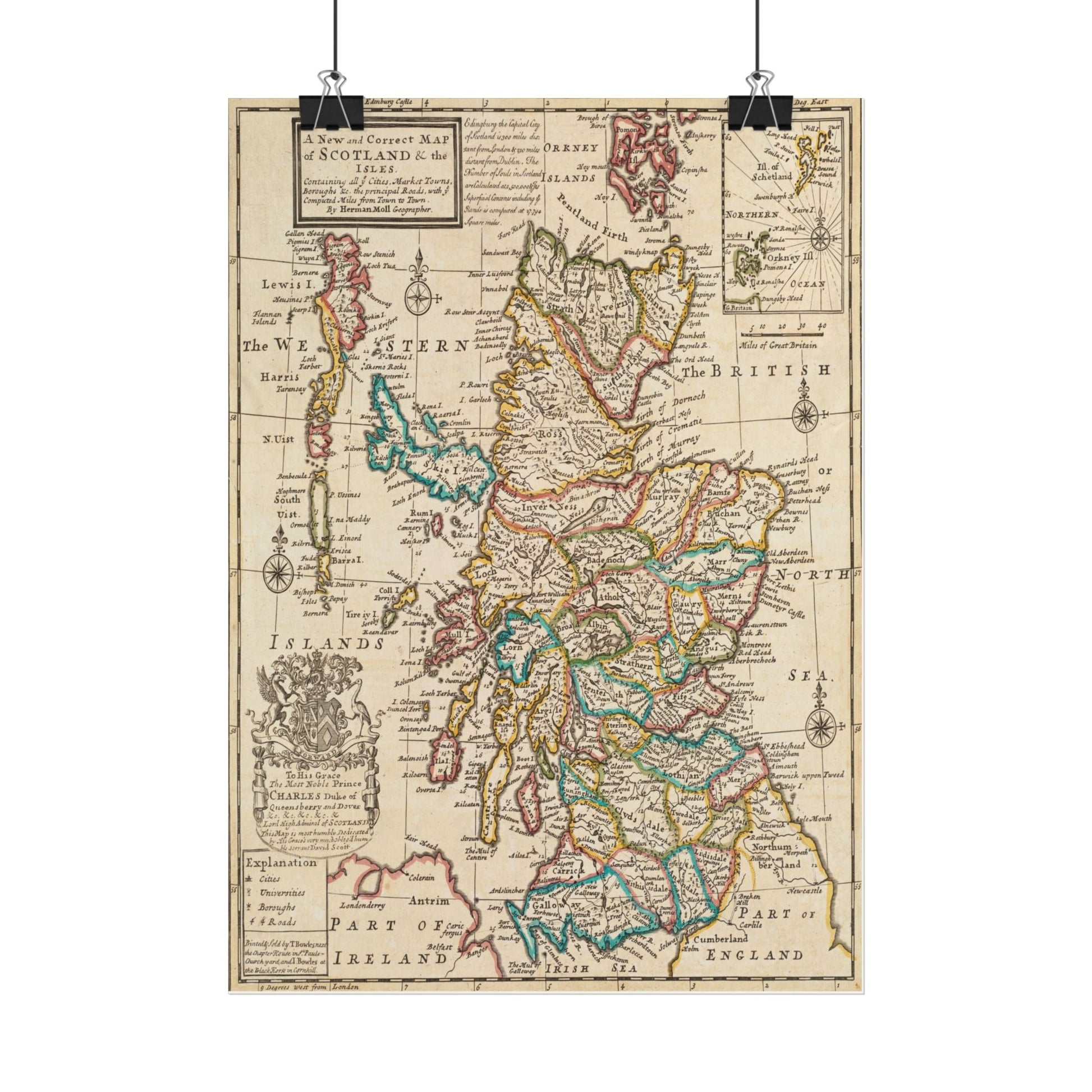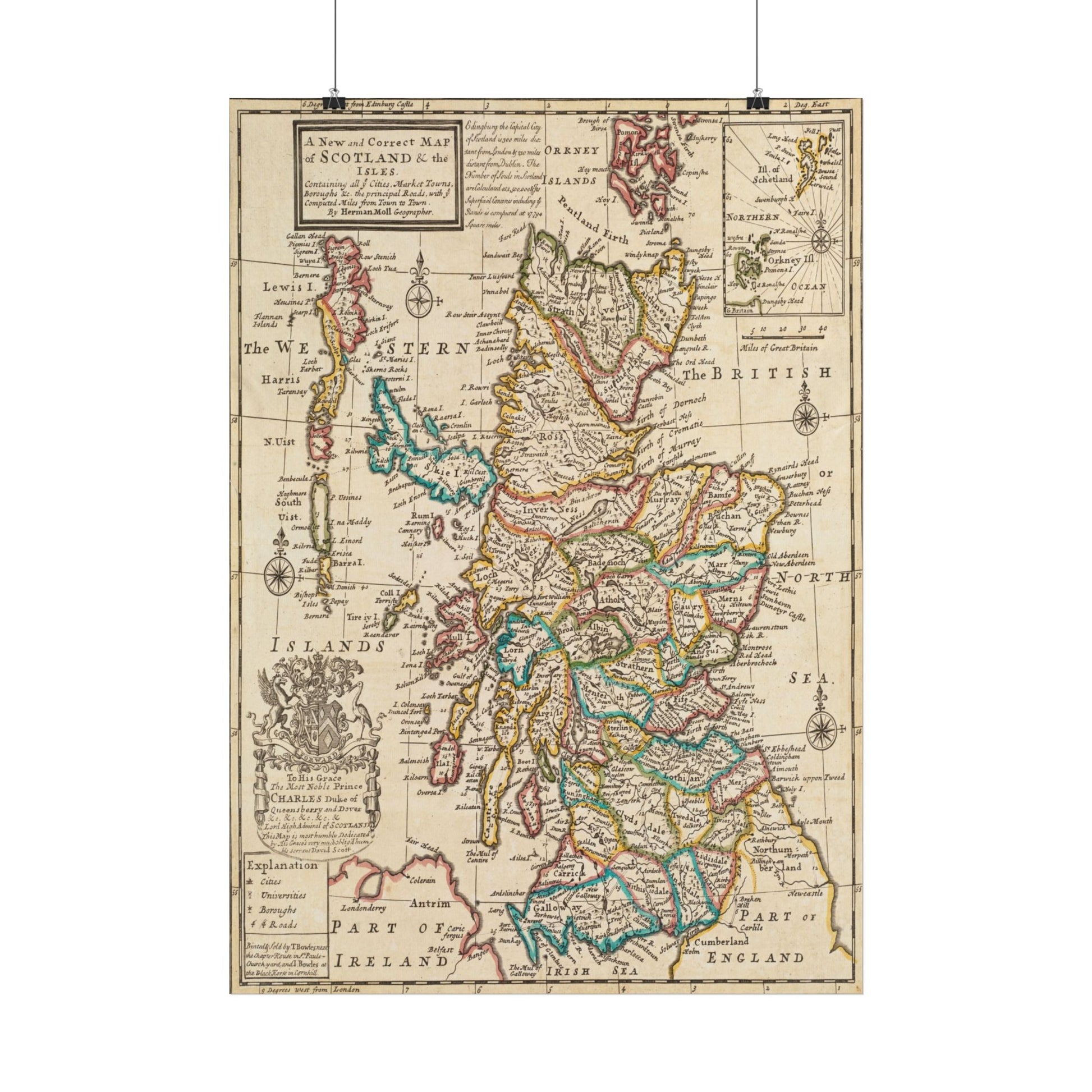 Engraved and published in London around 1732 by Herman Moll, one of the most influential British cartographers of the 18th century, this map, A New and Correct Map of Scotland and the Isles, offers a meticulous and artful representation of Scotland and its surrounding islands.
